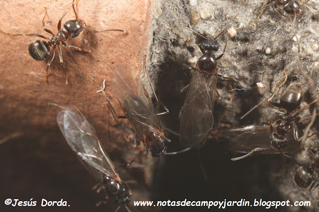 También aprovechan el mielato de los pulgones, pudiéndose confundir a simple vista con las Lasius niger que mostré en otra entrada. He revisado con cuidado las fotos donde tengo pulgones pastoreados por hormigas, pero ninguna era Tapinoma, otra cosa más que tengo que revisar en la próxima temporada. Si bien pueden usar los pulgones que vemos en los tallos y hojas, lo cierto es que hormigas de este género también pastorean los áfidos que viven en las raíces, lo que es realmente complicado de observar.